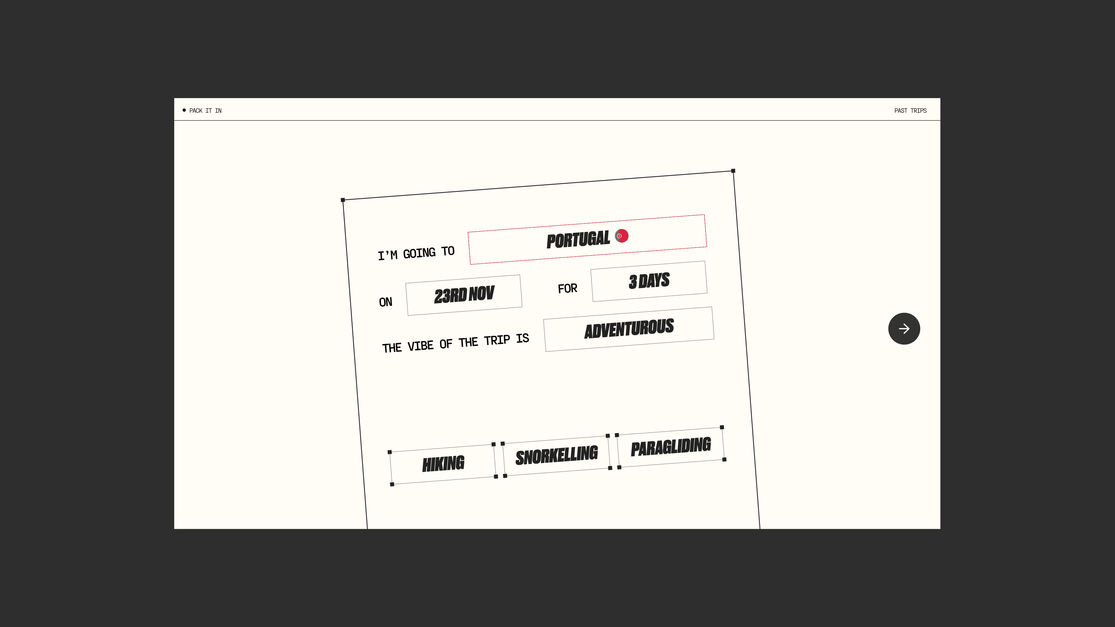 Pack It is an AI-powered packing assistant that transforms uncertainty into clarity. By analysing trip details, bag size, weather forecasts and planned activities, it generates a tailored packing list in seconds. The experience is intentionally lightweight. Users answer a few considered questions, select their luggage size, and receive a personalised list designed to fit both their trip and their space constraints. Pack It reframes packing from a stressful chore into a confident, guided experience — combining real-world utility with technology.